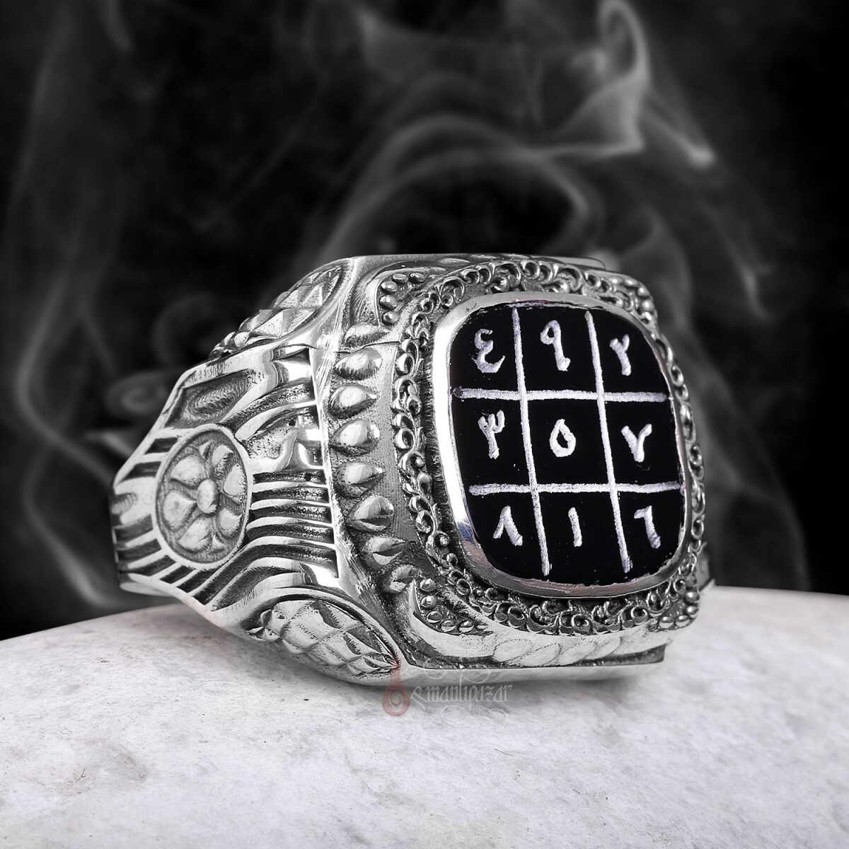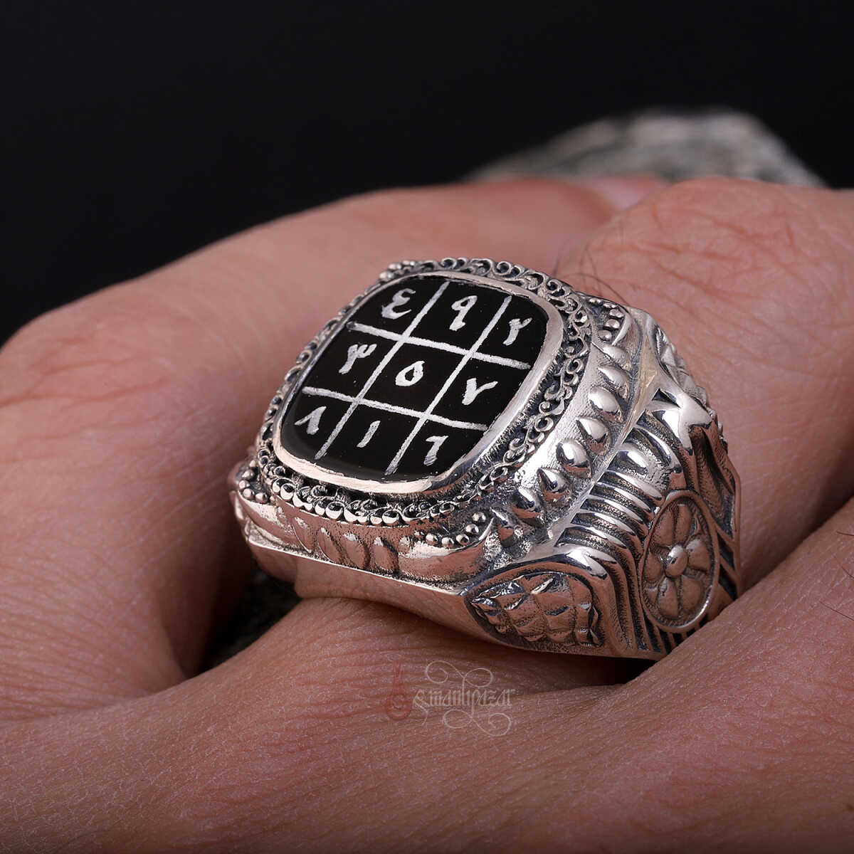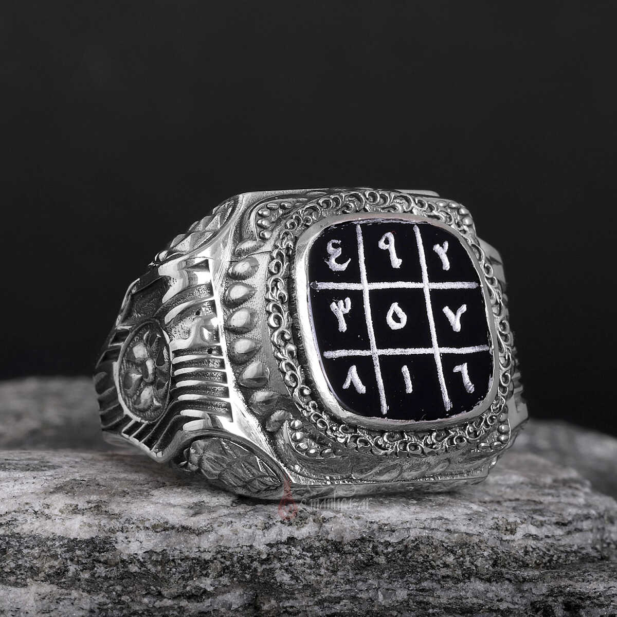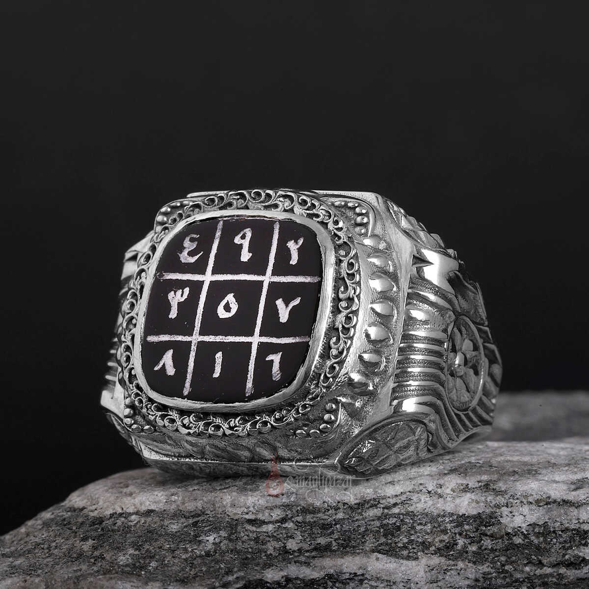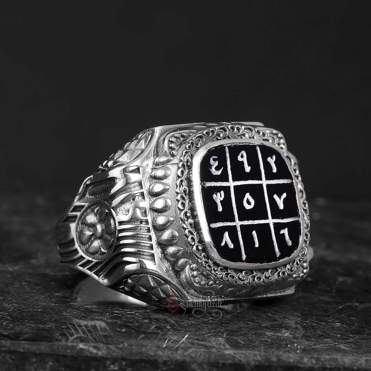 Bu özel tasarımda, büyük İslam âlimi İmam-ı Gazâlî’ye atfedilen ve çeşitli faziletleriyle bilinen 3’lü vefkler, yüzüğün merkezinde yer alan siyah akik taş üzerine tamamen el yazması olarak işlenmiştir.