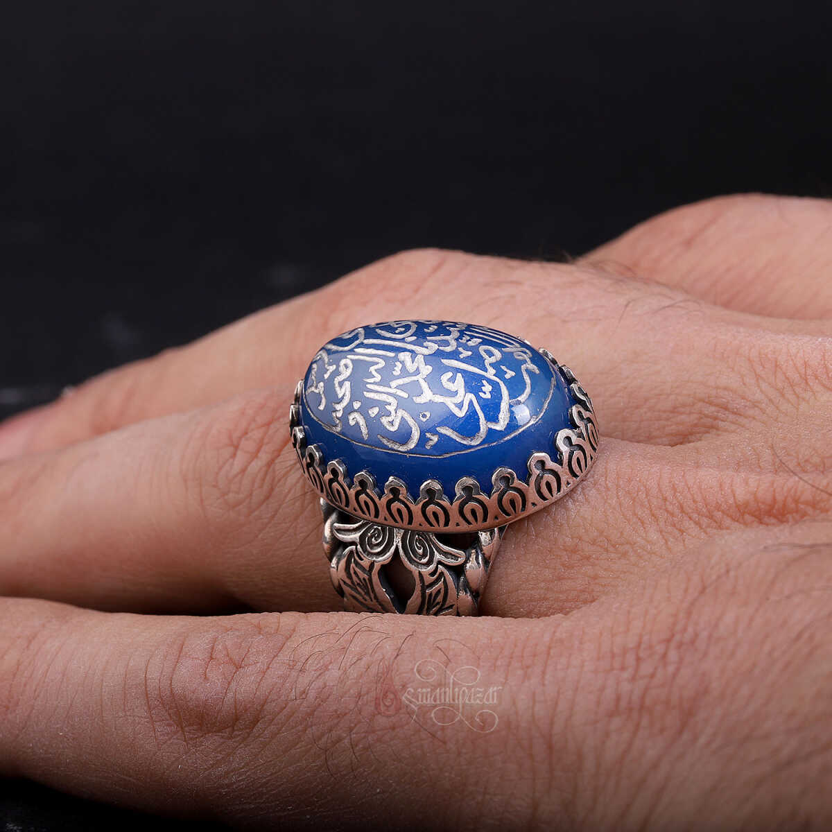 Salavat-ı Şerife'nin mavi akik taşıyla bütünleştiği bu yüzük, hem kalbinize hem parmağınıza yakışacak bir miras parçası.