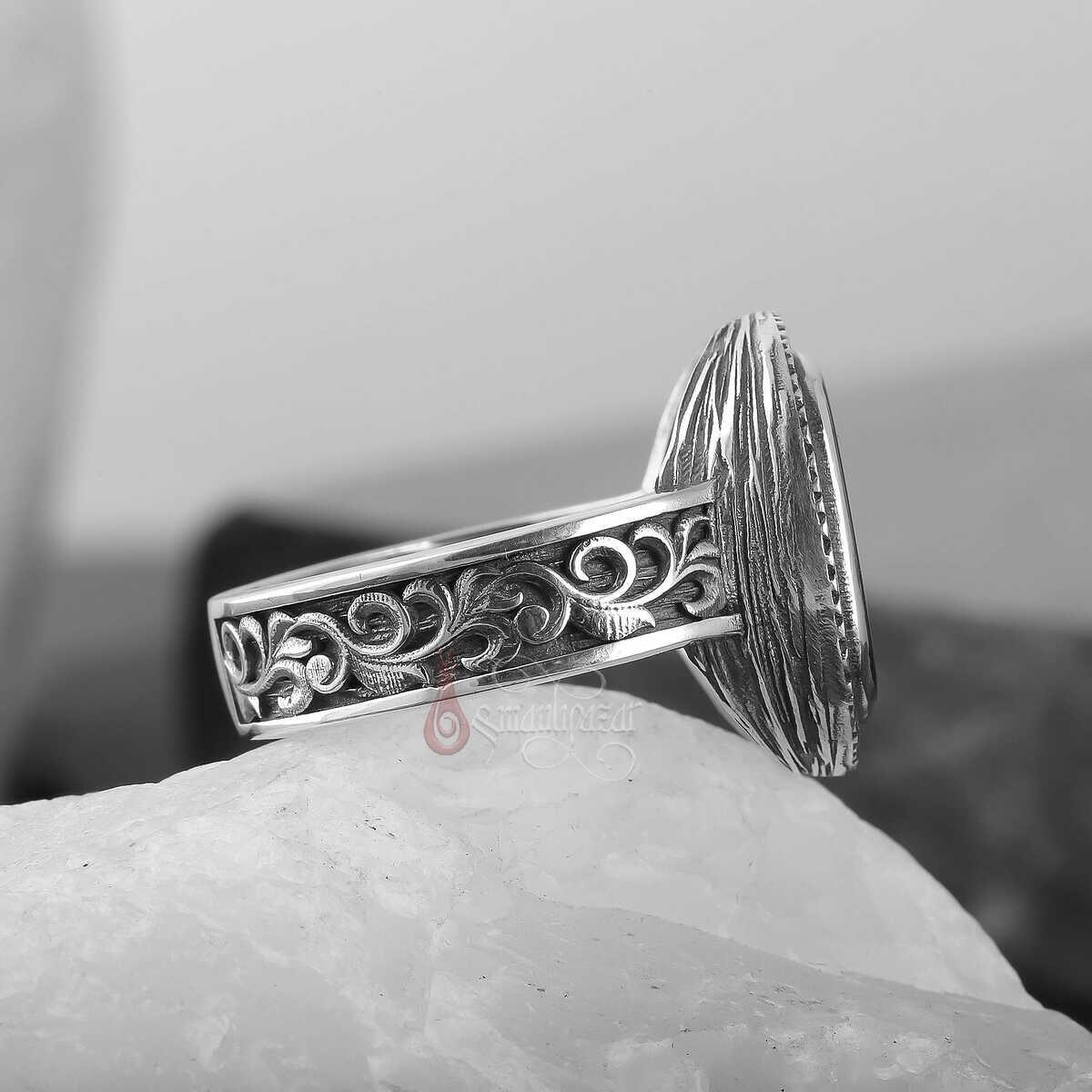 Erzurum’un ünlü kalem işçiliği ile akik taşının büyüleyici güzelliğini birleştiren bu yüzük, geleneksel zanaatkarlığın eşsiz bir örneğidir. 925 ayar saf gümüş üzerine tamamen el işçiliğiyle işlenen detaylar, yüzüğe hem sanatsal hem de tarihi bir değer katıyor. Doğal akik taşının güçlü enerjisiyle ruhunuzu, gümüşün zarafetiyle stilinizi tamamlayın.